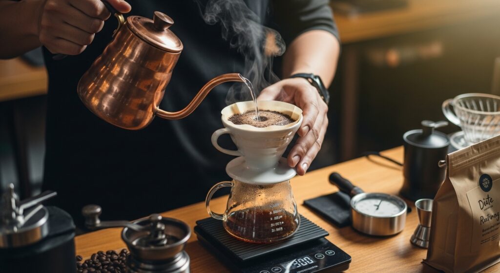 푸어오버는 물을 붓는 방식이 곧 추출 방식이에요. 최근 연구에 따르면 물줄기의 유량·높이·형태가 커피층의 교반과 추출 결과에 직접적인 영향을 미친다는 사실이 밝혀졌습니다.