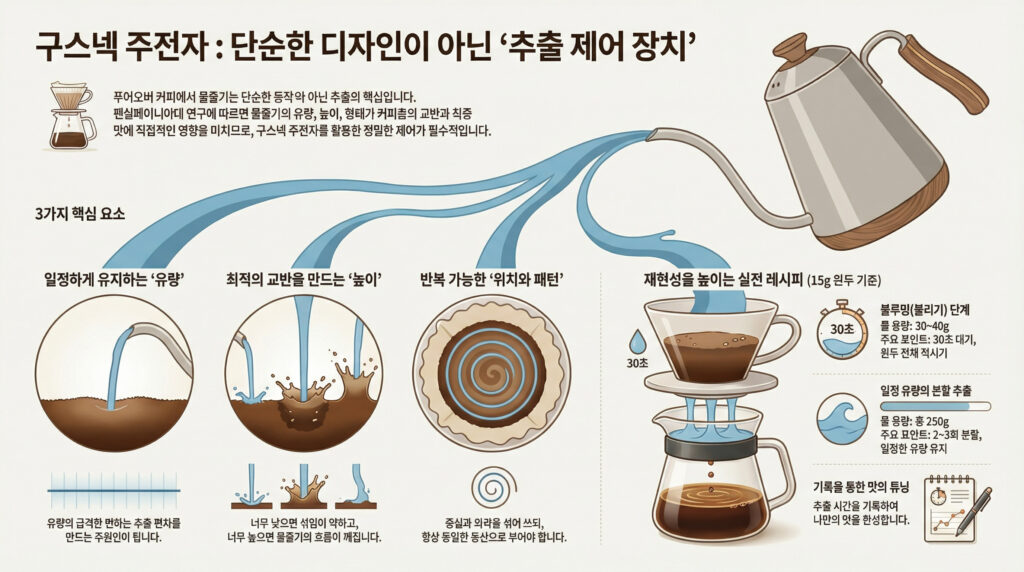 🔬 구스넥은 “예쁜 주전자”가 아니라 “물줄기 제어 장치”입니다